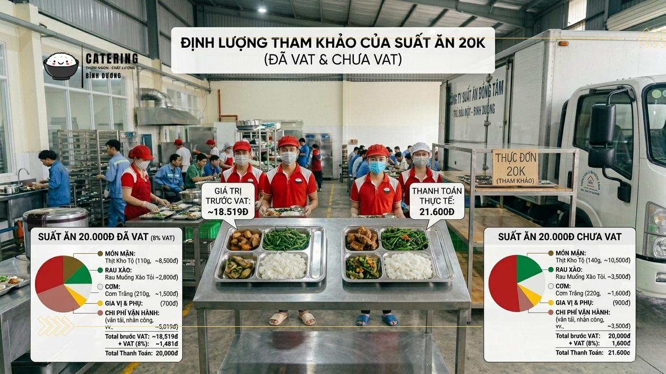 Nếu tính theo mức VAT 8%, thì suất ăn 20.000 đồng đã VAT chỉ còn khoảng 18.519 đồng trước VAT để phân bổ vào nguyên liệu, gia vị, nhân công, vận chuyển và các chi phí vận hành khác. Trong khi đó, nếu báo giá là 20.000 đồng chưa VAT, số tiền thanh toán thực tế sẽ là 21.600 đồng, đồng nghĩa với việc nhà cung cấp có biên độ dễ thở hơn để tăng định lượng món mặn, rau hoặc món phụ. Vì vậy, khi so sánh báo giá, không nên chỉ nhìn vào con số 20k mà cần nhìn đúng bản chất là đã bao gồm thuế hay chưa.